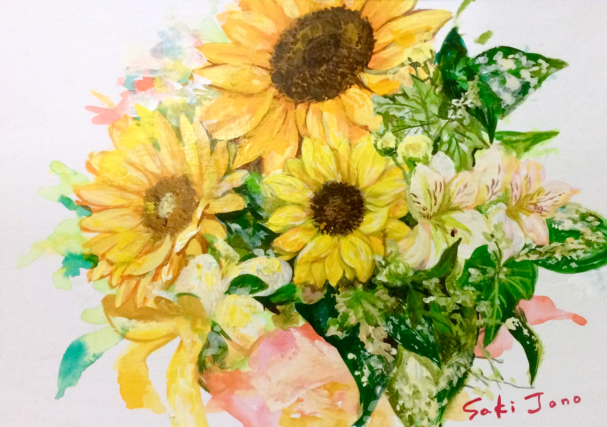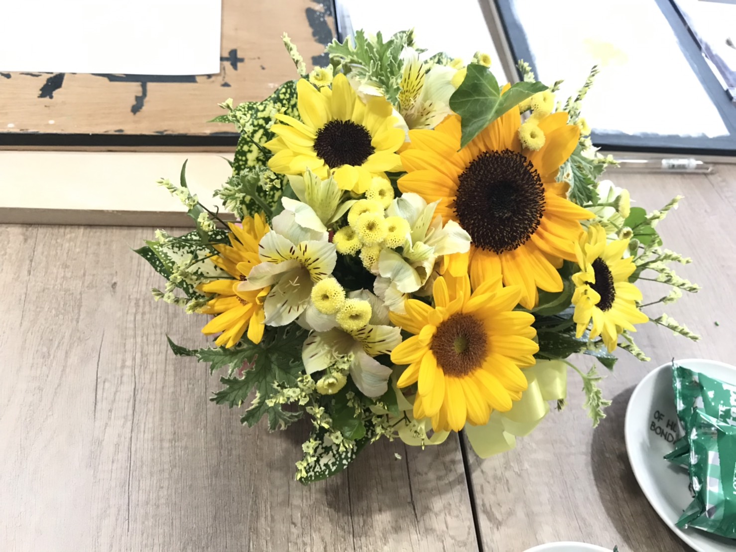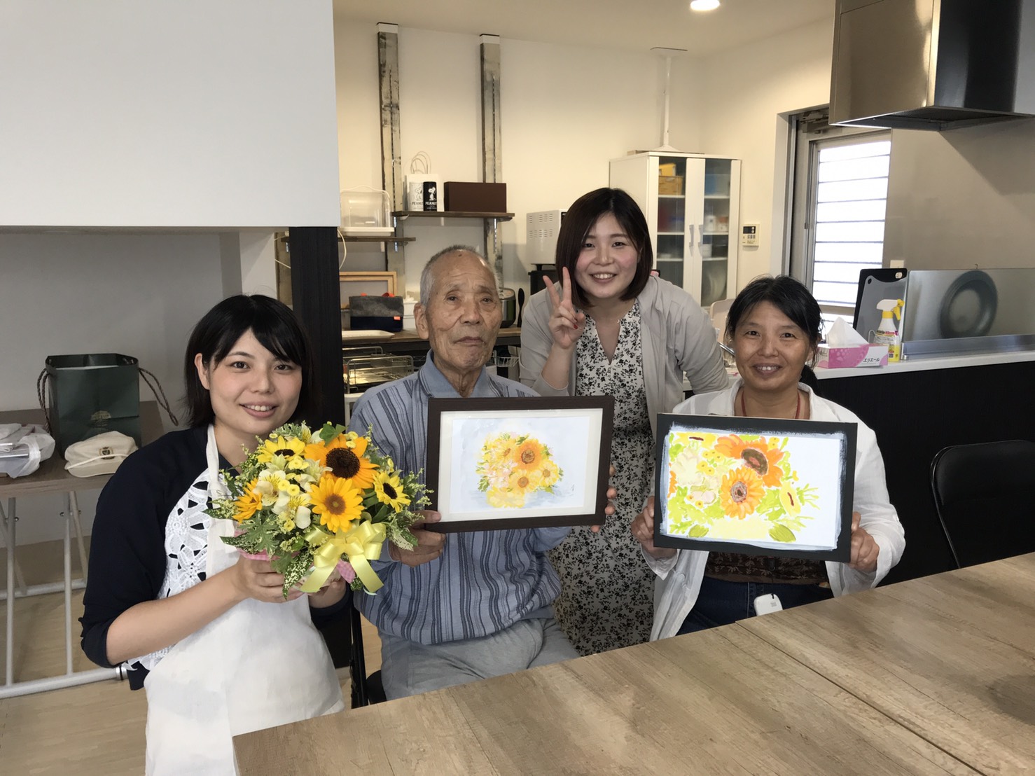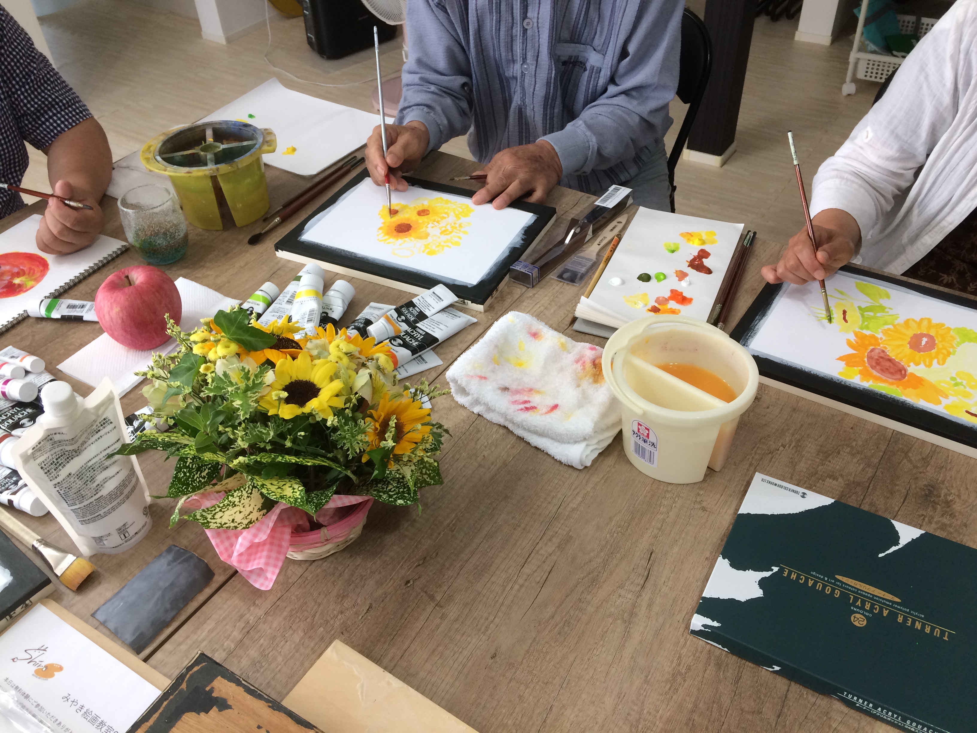今回は少し難しいモチーフにチャレンジしました。鳥栖の生花店で作ってもらった、ひまわりのアレンジメントです。見学に来ていただいた方がいらっしゃったので、段々と教室らしくなって来ましたよ!参考に描く様子は下の動画をクリックしてご覧ください。