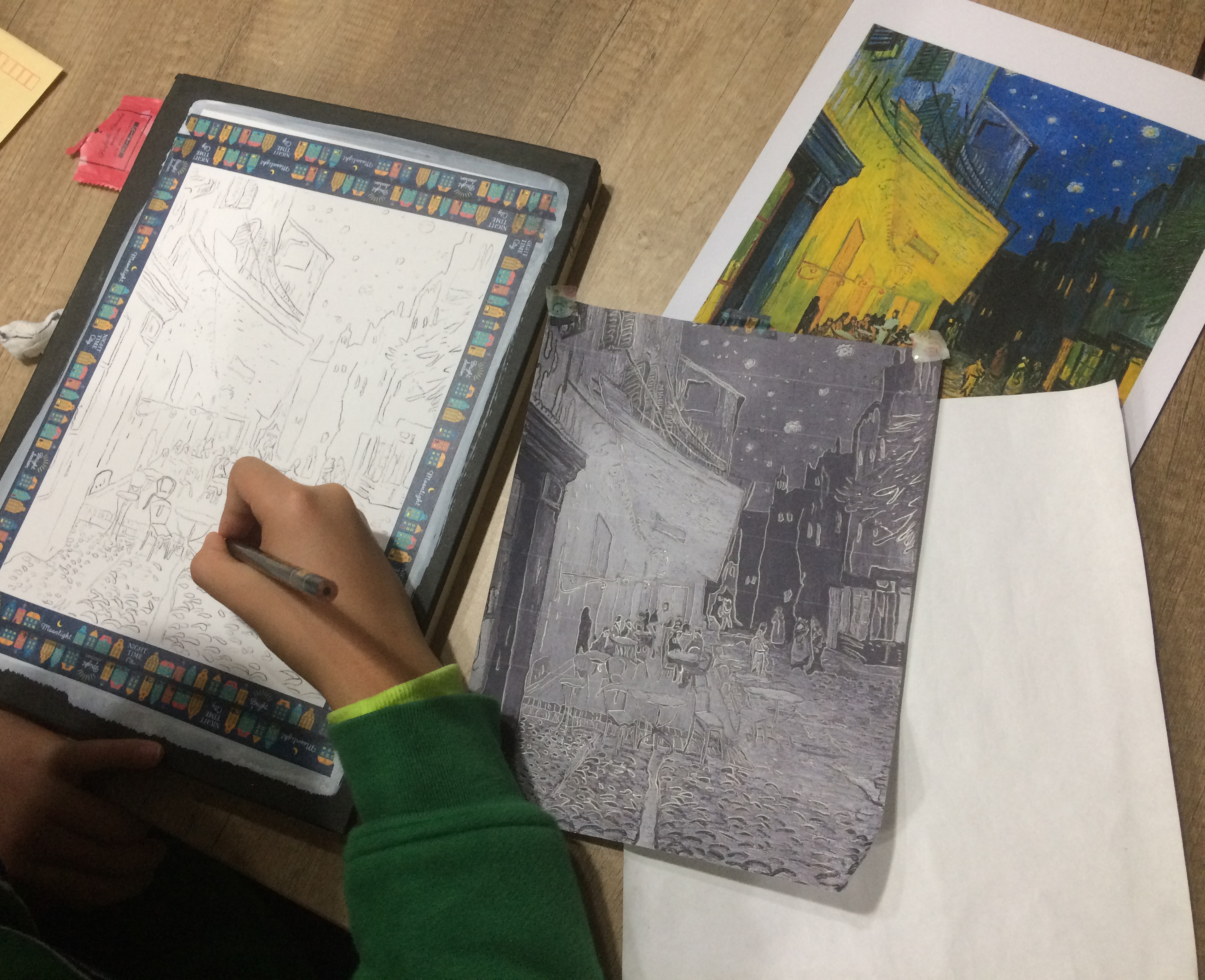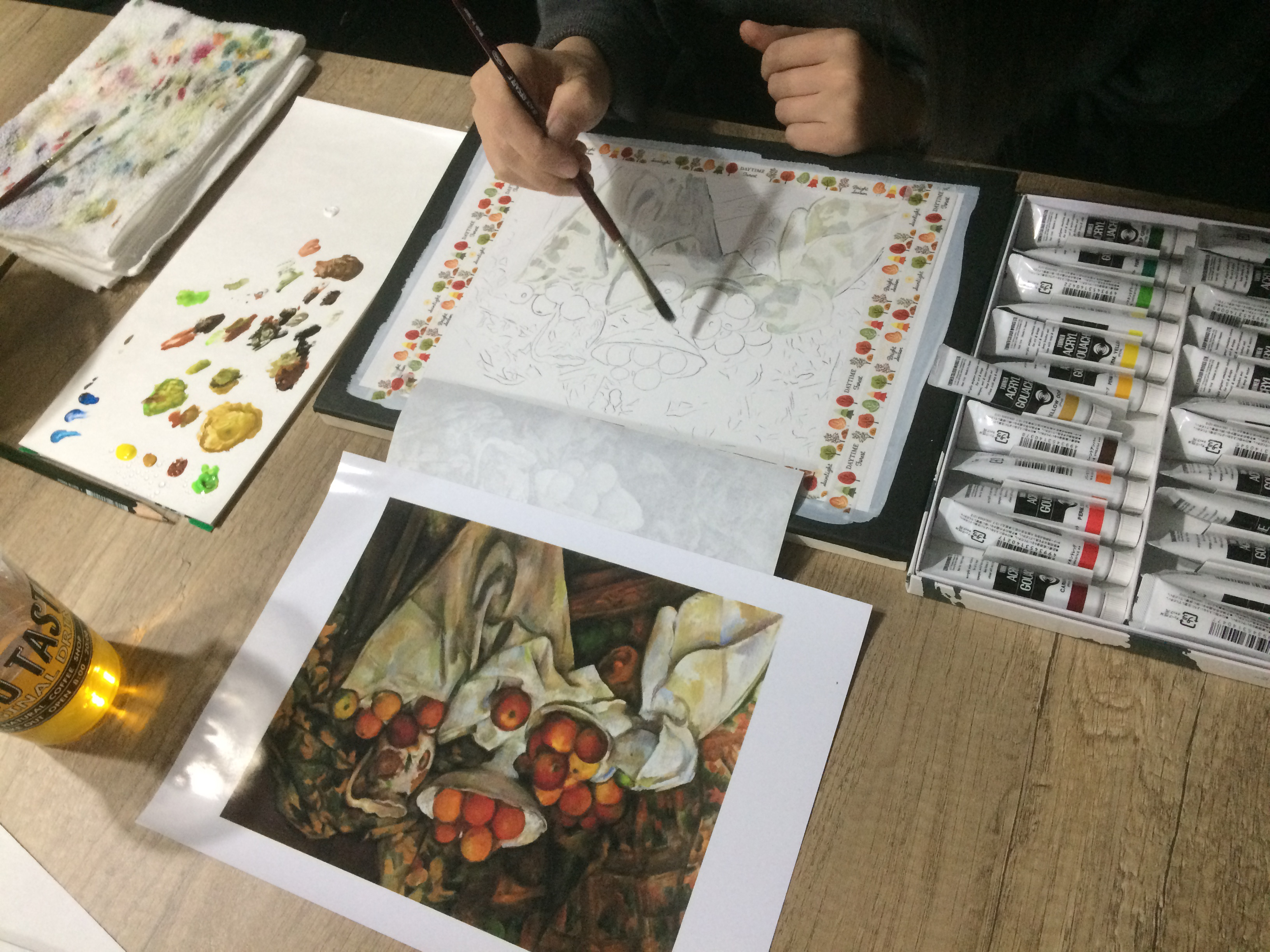 今回の課題は名画の模写です。ゴッホ、セザンヌ、ルノアール、フェルメールの作品の中で好きなものを選んで模写しています。実物よりかなり小さく、マチエールも見えませんが、画面構成と完成度への意識を向けるための練習になります。普段は静物が主ですから、中々満足のいく所まで取り組む事は難しいと思います。これから何週かに渡って、やり切った!と思う所まで挑戦していきます。