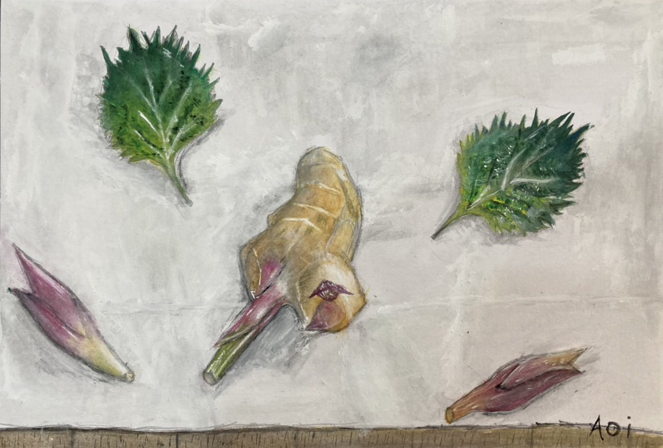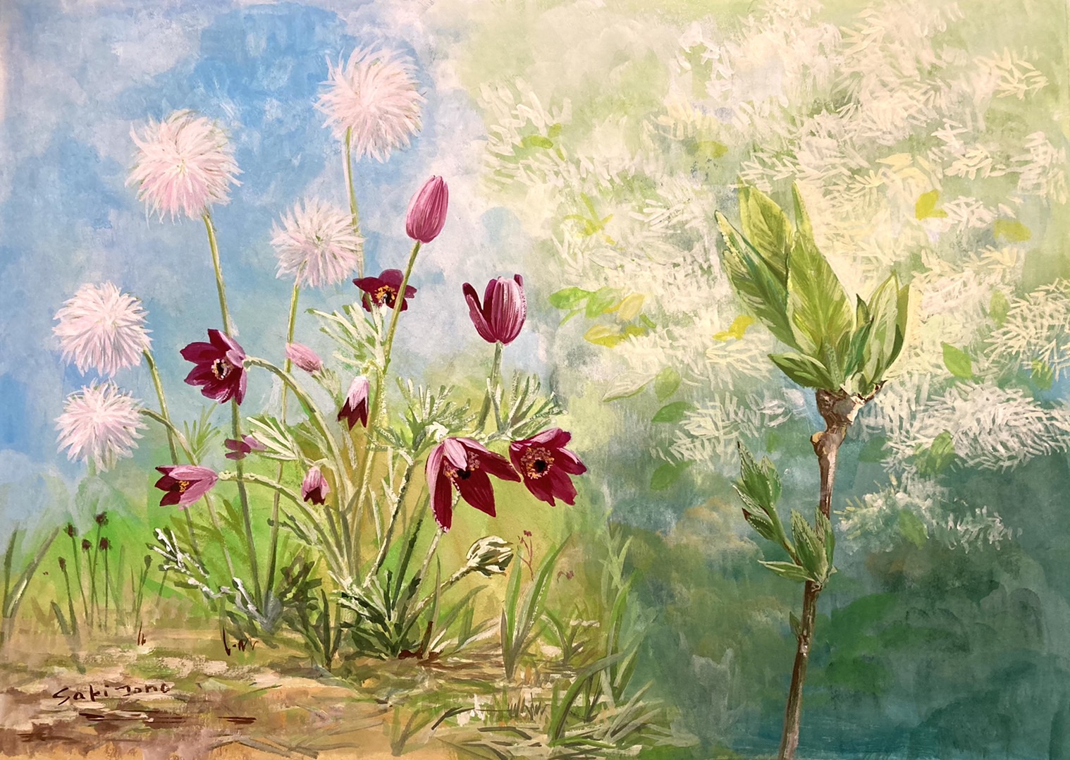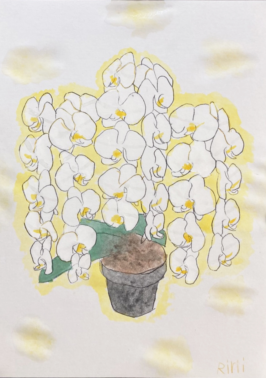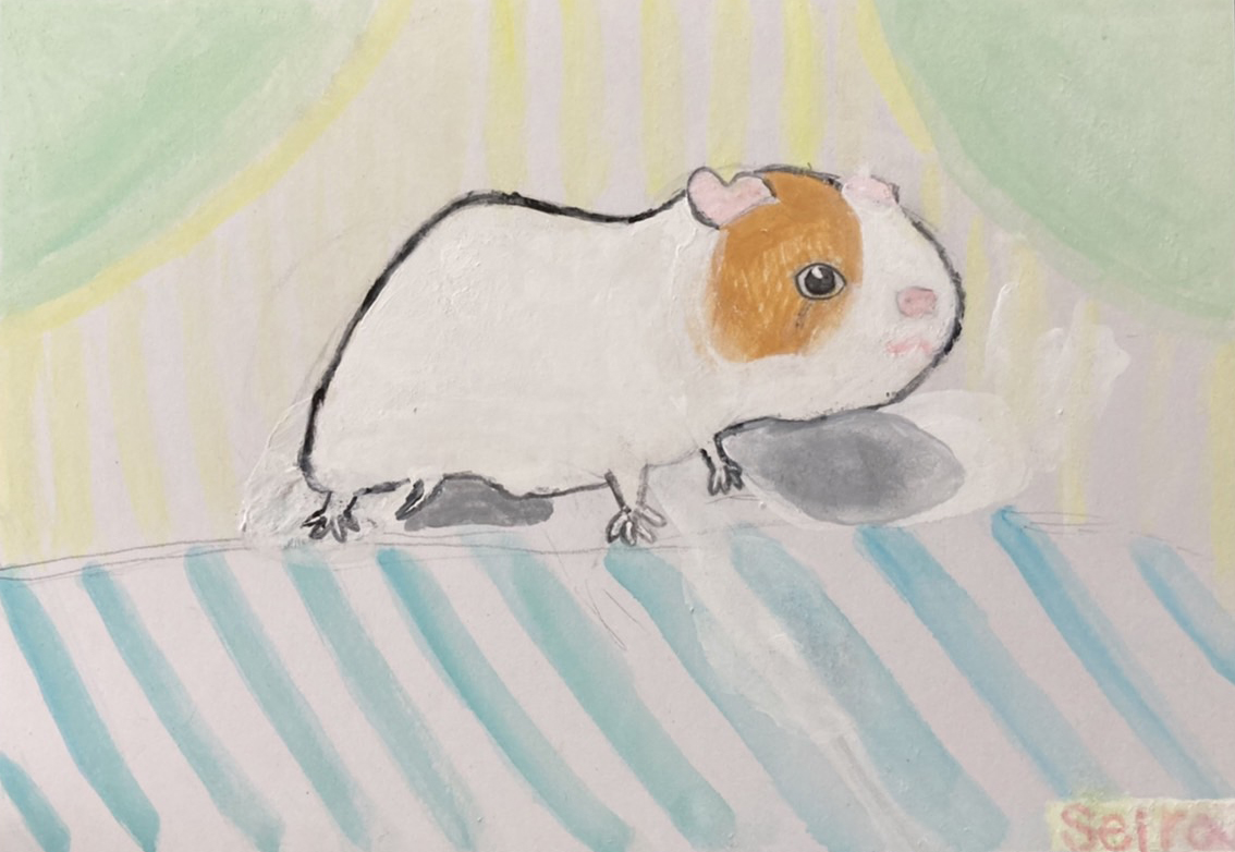 透明水彩とアクリルガッシュの二つの絵の具を使い分けています。落ち着いた色味で、下書きの鉛筆の線を活かしたい時は透明水彩で描きます。逆に明るい色で形をはっきり見せたい時には、アクリルガッシュを使います。
